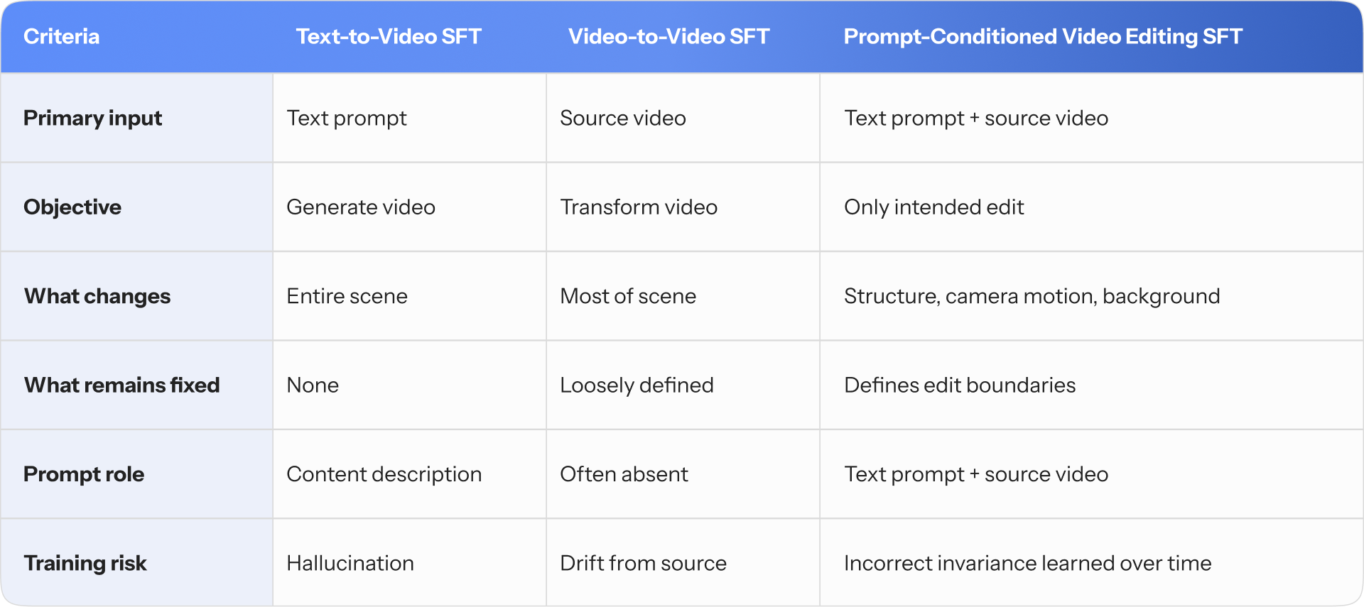 Training-grade Video SFT requires explicit control over what must remain unchanged