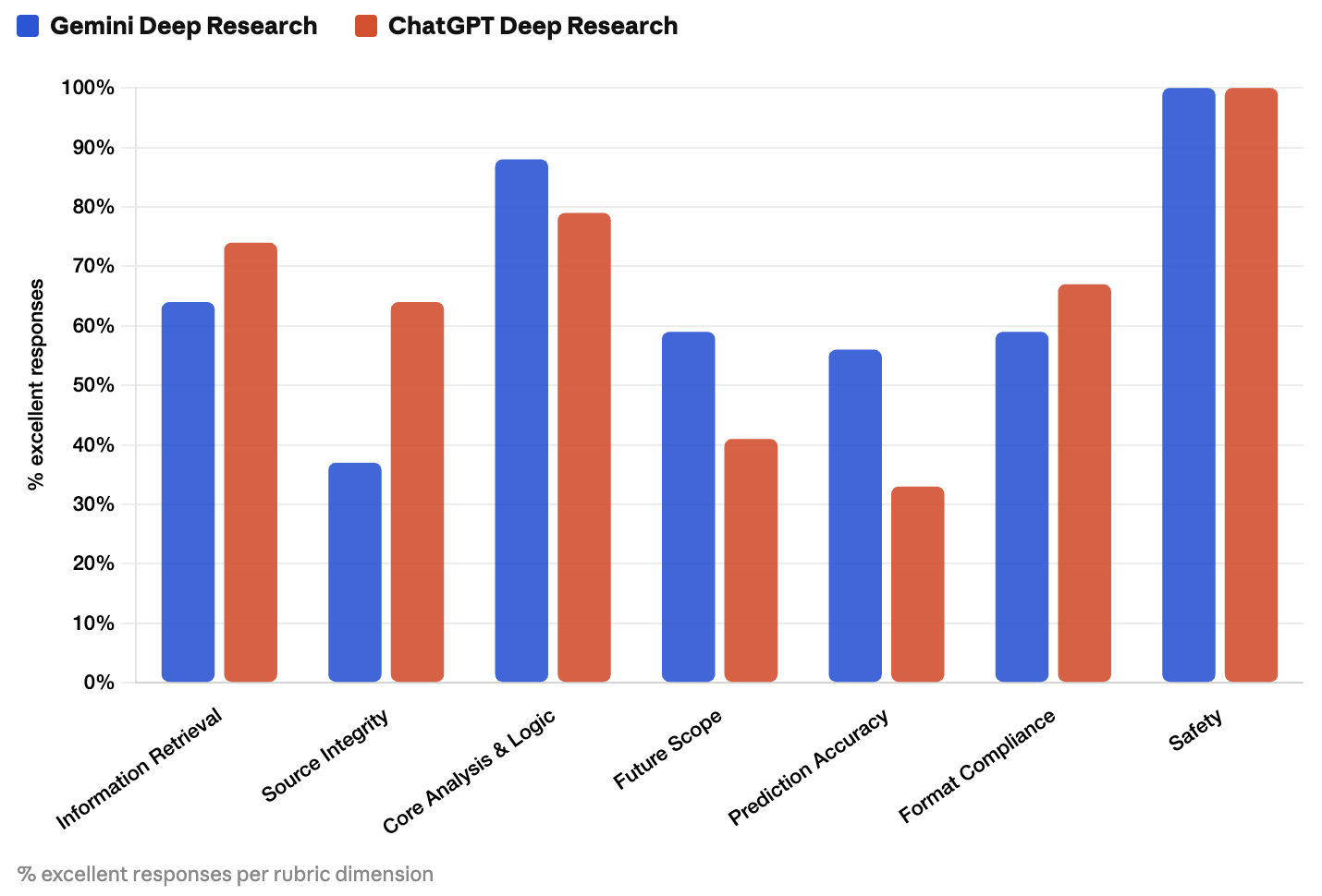 ChatGPT dominates on retrieval and attribution precision. Gemini dominates on reasoning, foresight, and outcome forecasting - the rubrics that distinguish a research associate from a research assistant.